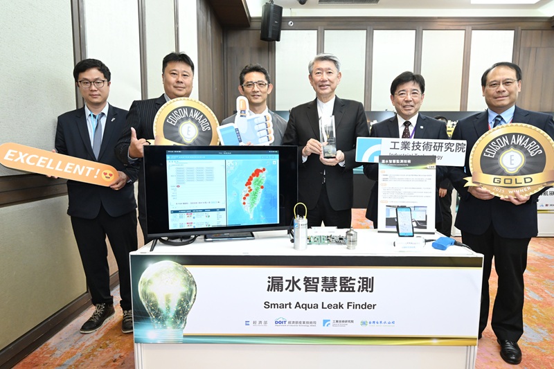 由工研院研發的金獎技術「漏水智慧監測技術」結合本土化漏水診斷設備與AI演算法,並整合5G與AIoT技術,可精準定位管網漏水點,打造高效能的智慧檢測方案。每年省下相當於一座中型水庫的水量。圖左起為工研院材化所張洪誌、工研院材化所經理蔡曜隆、經濟部產業技術司司長郭肇中、經濟部部長郭智輝、工研院院長劉文雄、工研院材化所所長邱國展。