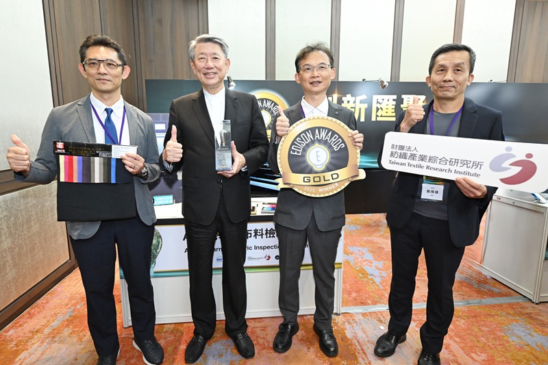 紡織所以「AI自學驗布系統」榮獲愛迪生獎金牌獎,結合AI演算法與高解析光學技術,高速檢測布料瑕疵,驗布速度每分鐘高達120碼,遠超傳統驗布機,檢測準確率高達95%。並已與加拿大頂尖戶外品牌始祖鳥、國內機能布料大廠大統新創等企業合作,推動智慧驗布技術,提升臺灣紡織業競爭力。圖左起為經濟部產業技術司司長郭肇中、經濟部長郭智輝、岳揚智控董事長洪忠岳、紡織所協理黃博雄。