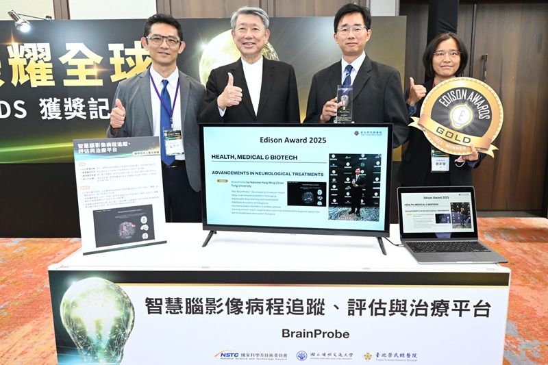 陽明交大與臺北榮總投入腦影像與AI研究,成功開發出領先全球的腦影像分析技術「智慧腦影像平台BrainProbe」能以個人化的方式定量不同大腦區域結構和功能退化狀況,作為後續診斷及精準腦刺激治療的客觀依據。經濟部產業技術司司長郭肇中、經濟部部長郭智輝、陽明交大主任楊智傑、陽明交大經理劉美琴。