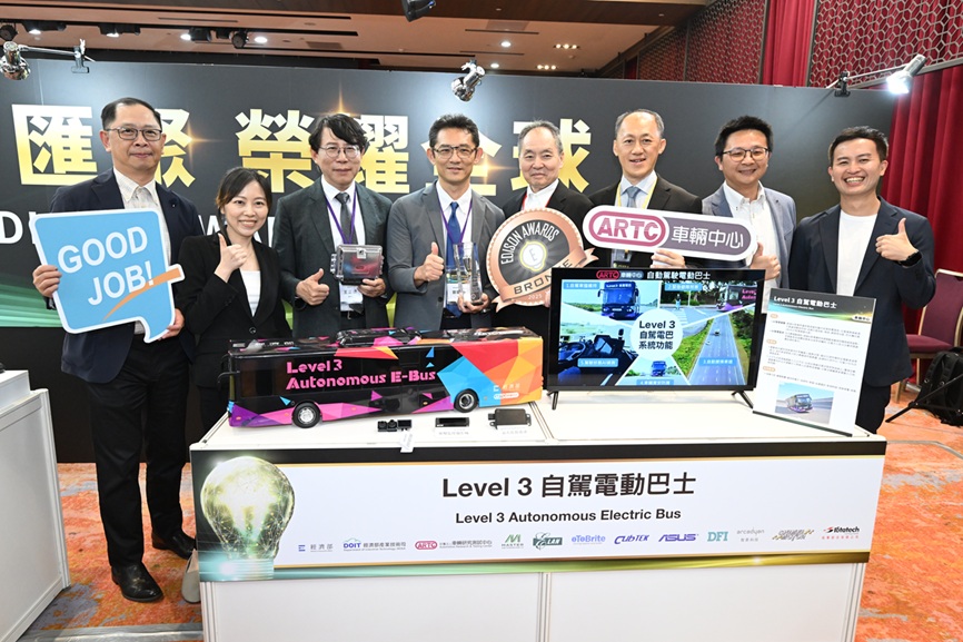 經濟部產業技術司補助車輛中心研發全臺第一輛「Level 3自駕電動巴士」,結合雷達感測與AI影像辨識實現車道置中、避障轉向及車道變換等五大自駕功能,還可監控駕駛眼睛閉合、視線偏移等狀況。目前已與兩家巴士廠商合作,且與義隆電子、歐特明電子、為昇科、友通資訊及智易科技等國內車用感測器與系統廠商合作,可應用於市區公車專用道,提升智慧交通發展。由左至右為車輛中心研發經理許文賢、車輛中心資深專員許怡苹、成運汽車董事長吳定發、車輛中心協理陳建次、車輛中心副理葉重宇。