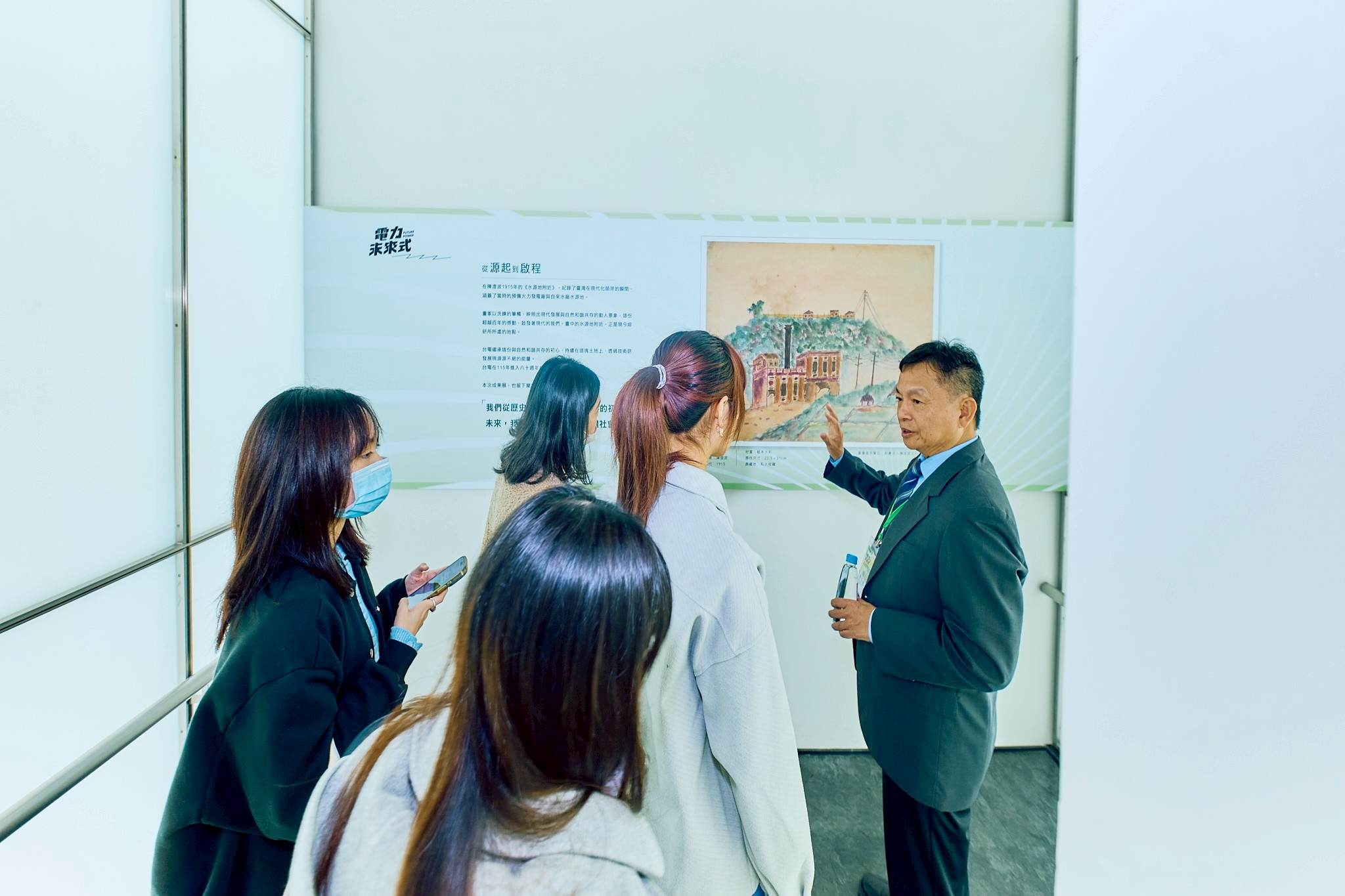 圖說:台電研發機構最早可追溯到1968年創立的「電力研究所」,隨研究需求及規模擴張,2001年正式成立「綜合研究所」。展區特別呈現臺灣重量級畫家陳澄波作品《水源地附近》,畫中描繪的火力電廠現址即為如今的綜研所,也象徵從發電場域到研發基地的跨世紀電力傳承